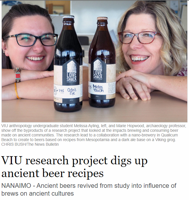 On March 22, Dr Marie Hopwood and Melissa Ayling, VIU Anthropology Major, presented their research work on ancient beer, Drinking Beer in a Blissful Mood: An Experimental Archaeology of Beer. Learn more about their research on YouTube. Their project was also featured in the Nanaimo News Bulletin, 9 April 2019.